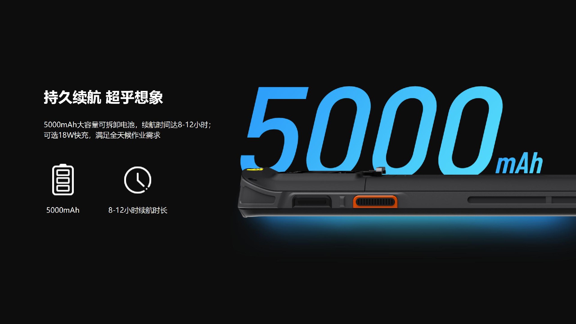 5000mAh大容量可拆卸電池,續航時間達8-12小小時;可選18W快充,滿足全天候作業需求